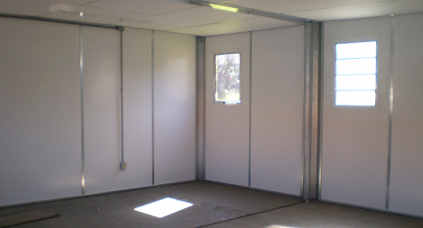 PAREDES (LATERAIS): Fechamento em painéis metálicos, que consistem em duas chapas de aço galvanizado de 0,5mm de espessura com pintura eletrostática interna e externa na cor branca e preenchimento entre as chapas com painéis de eps 35mm de espessura (30 quilos/m³).